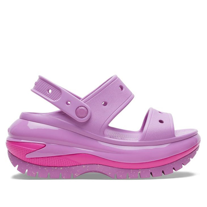 The look and feel of our Classic Mega Crush Clog is now available in sandal form. Introducing the Classic Mega Crush Sandal, featuring an enhanced rubber tread, updated detailing around the outsole and a platform ready to take any outfit to the next level. A two-strap upper and secure backstrap help ensure a secure fit, while boasting holes for personalization with Jibbitz™ charms. Are you ready for your new crush?