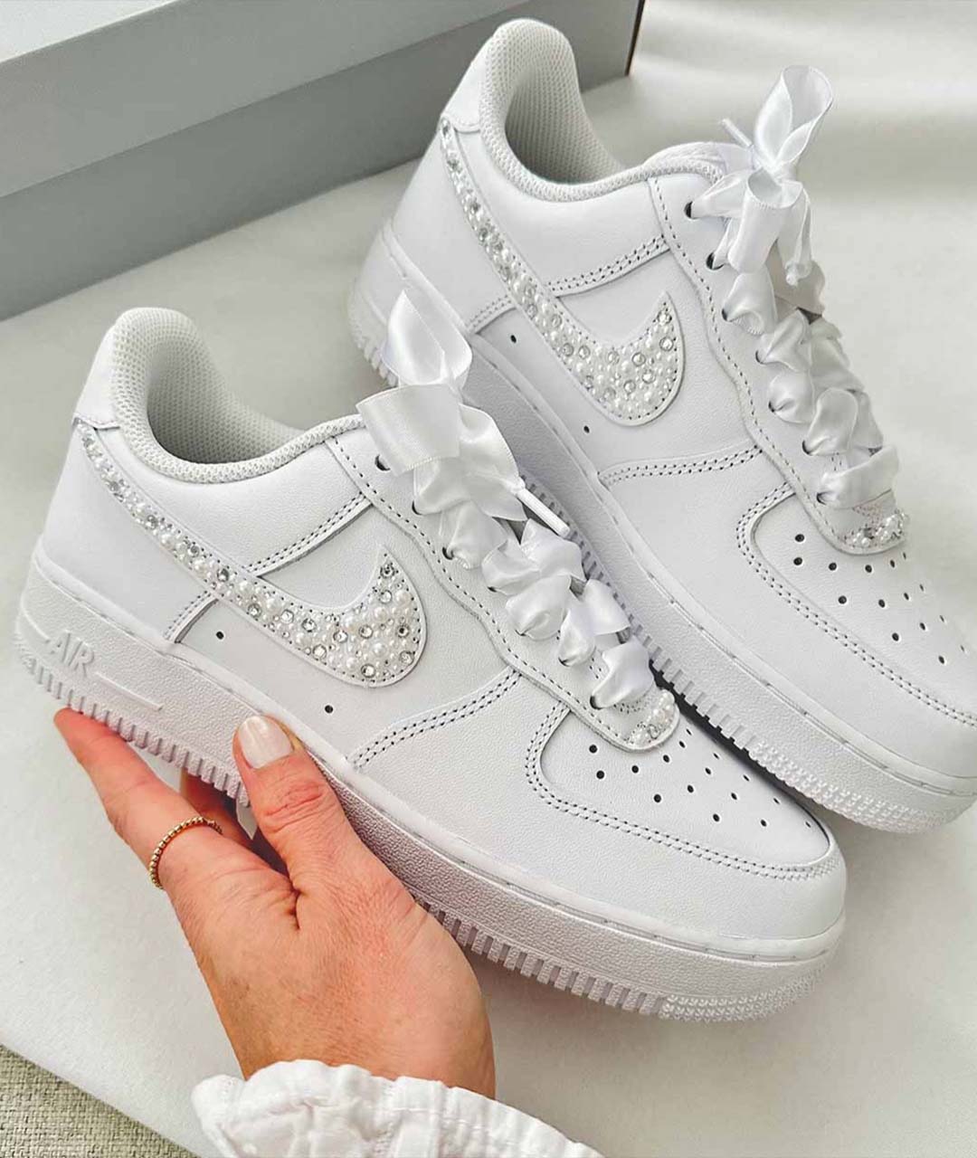 Elevate your special day with the NIKE AIR FORCE 1 CUSTOM BRIDAL EDITION. Made with top-quality materials, these Sneakers feature a custom design perfect for any bride. The timeless style and comfort of the iconic Air Force 1 will keep you dancing all night long. Perfect for any wedding day look.