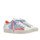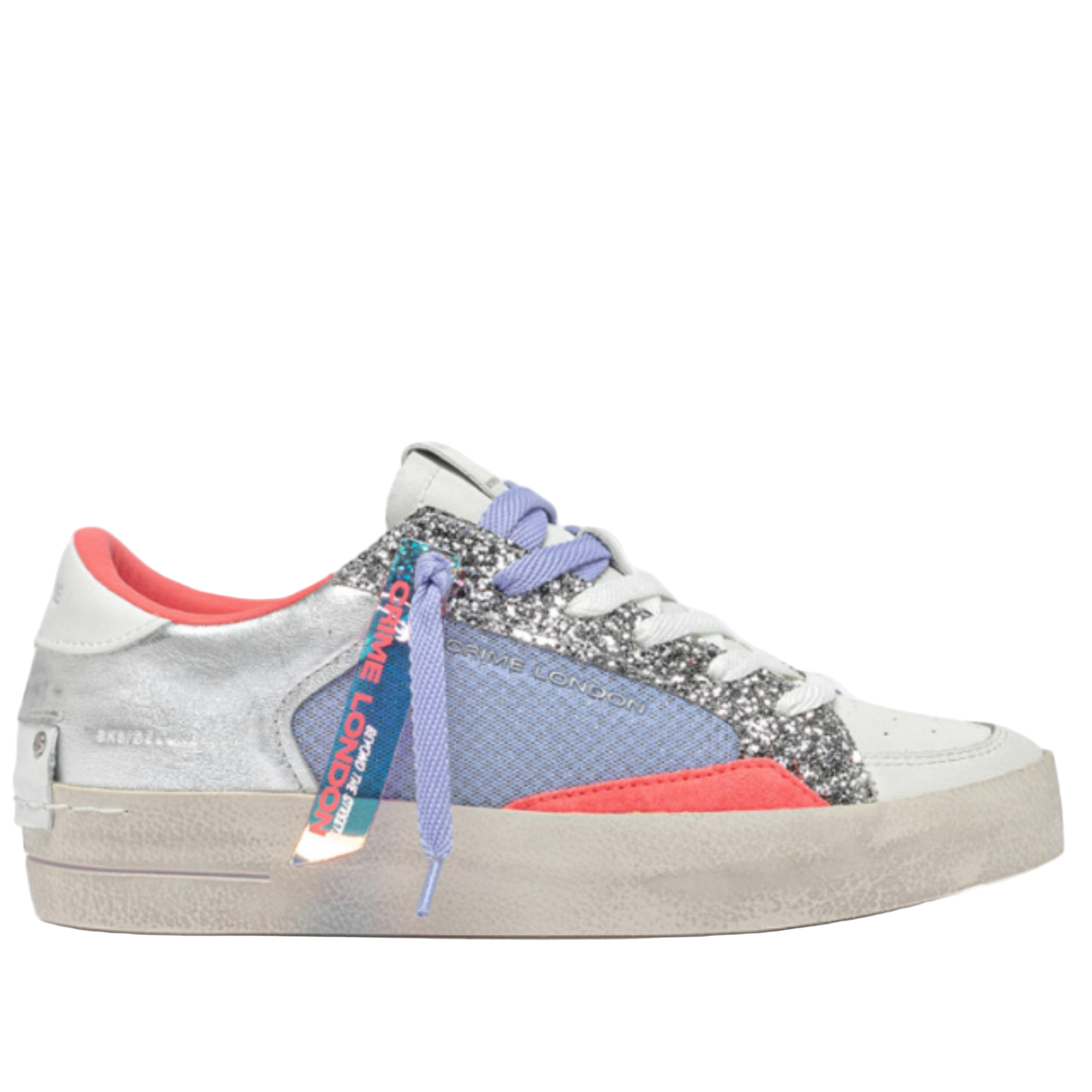 - Silver laminated leather and glitter upper, lavender fabric and fluo coral suede details
