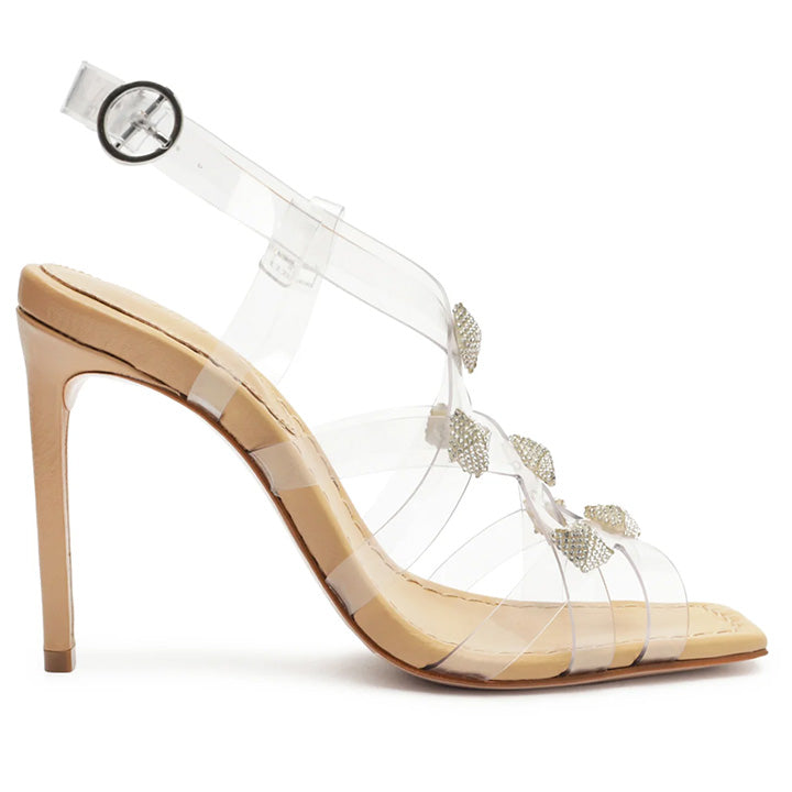Showcasing vinyl criss-cross straps topped with embellished studs and a thin stiletto, this sandal gives your wardrobe an edgy and classy finish.