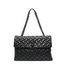 Black, leather, quilted design, signature eagle head pendant, interlocking chain shoulder strap, top flap with magnetic snap, main compartment, divided compartment with dividers, internal logo stamp