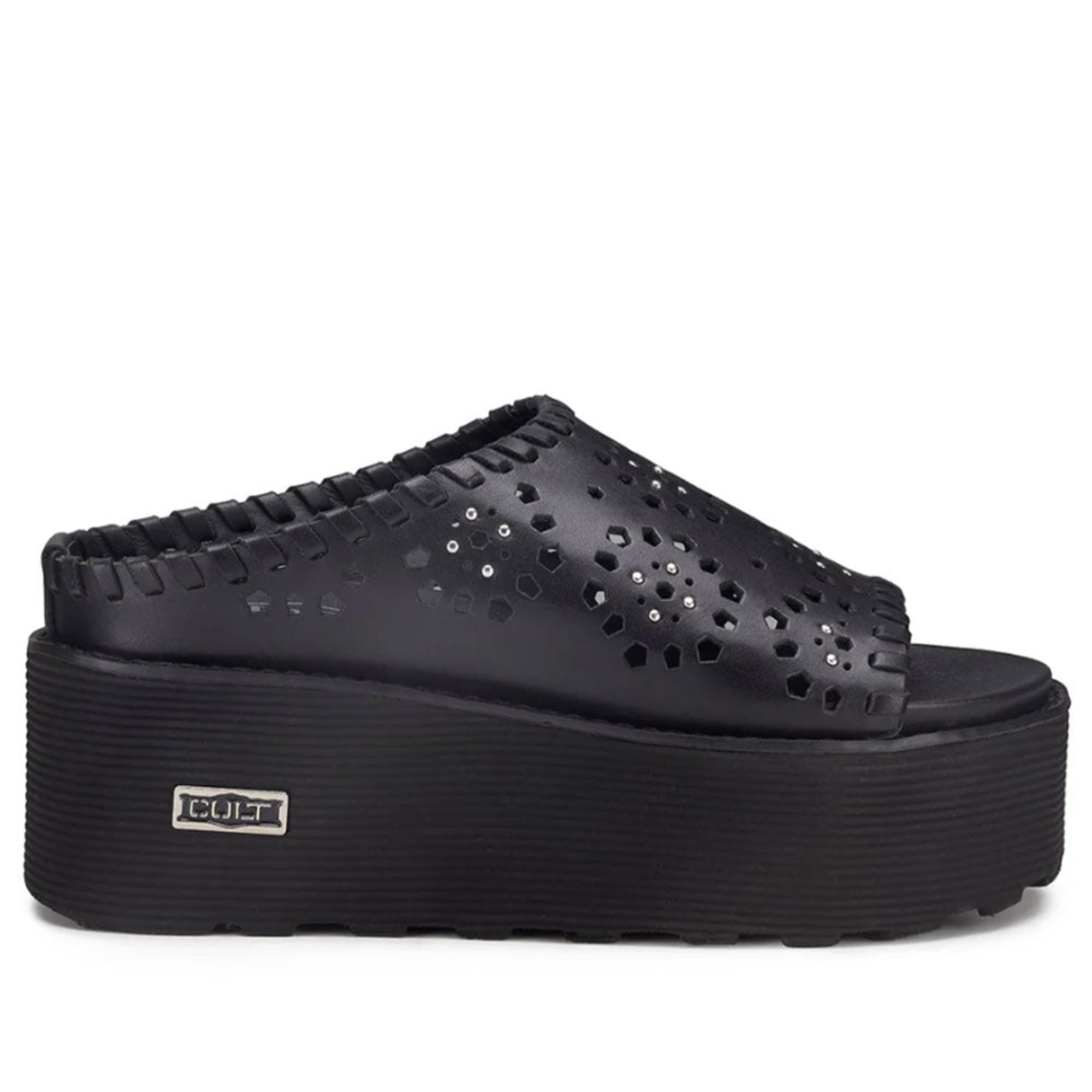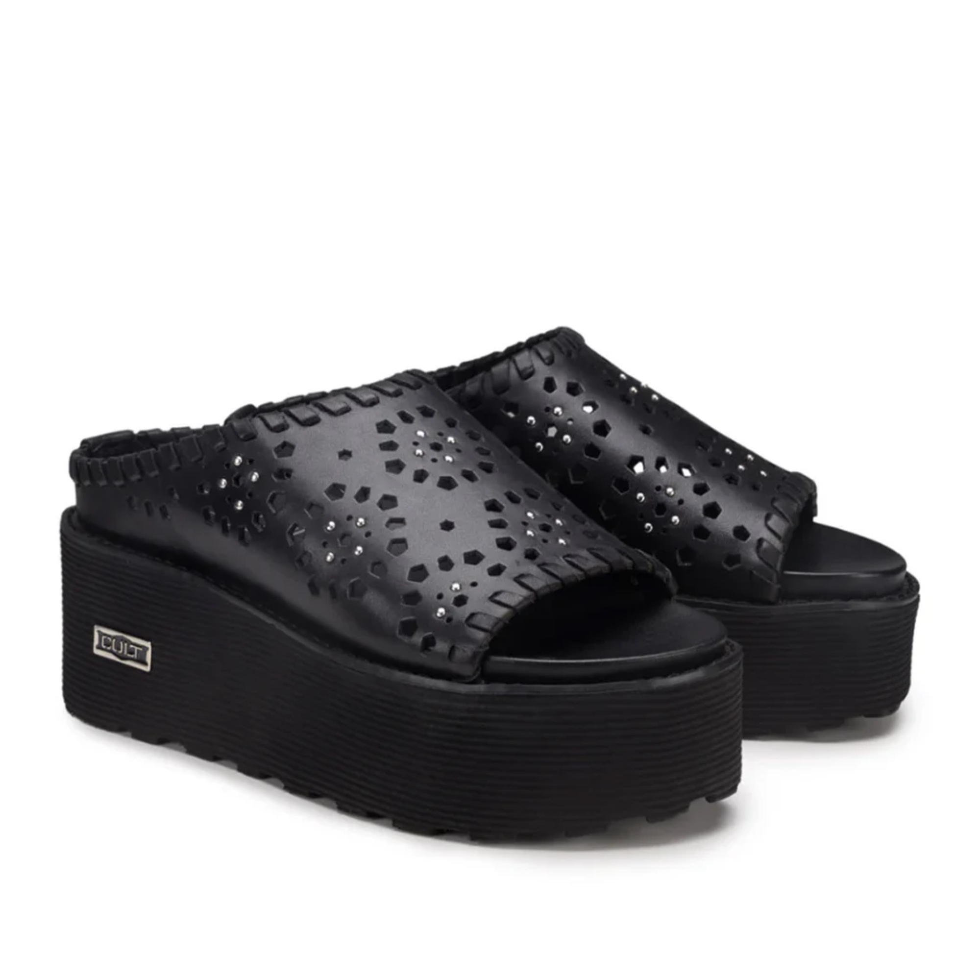 A true must-have this season, these CULT Sandals sit on a platform sole and are secured by a maxi perforated black leather strap with floral designs and mini metal studs. Contemporary and minimalist, these Sandals are perfect for pairing with shorts, summer maxi dresses, and colorful blouses.