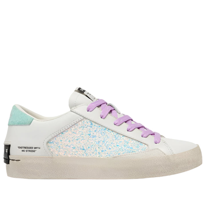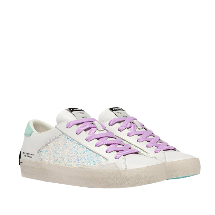 - White leather upper with iridescent white glitter , white suede details