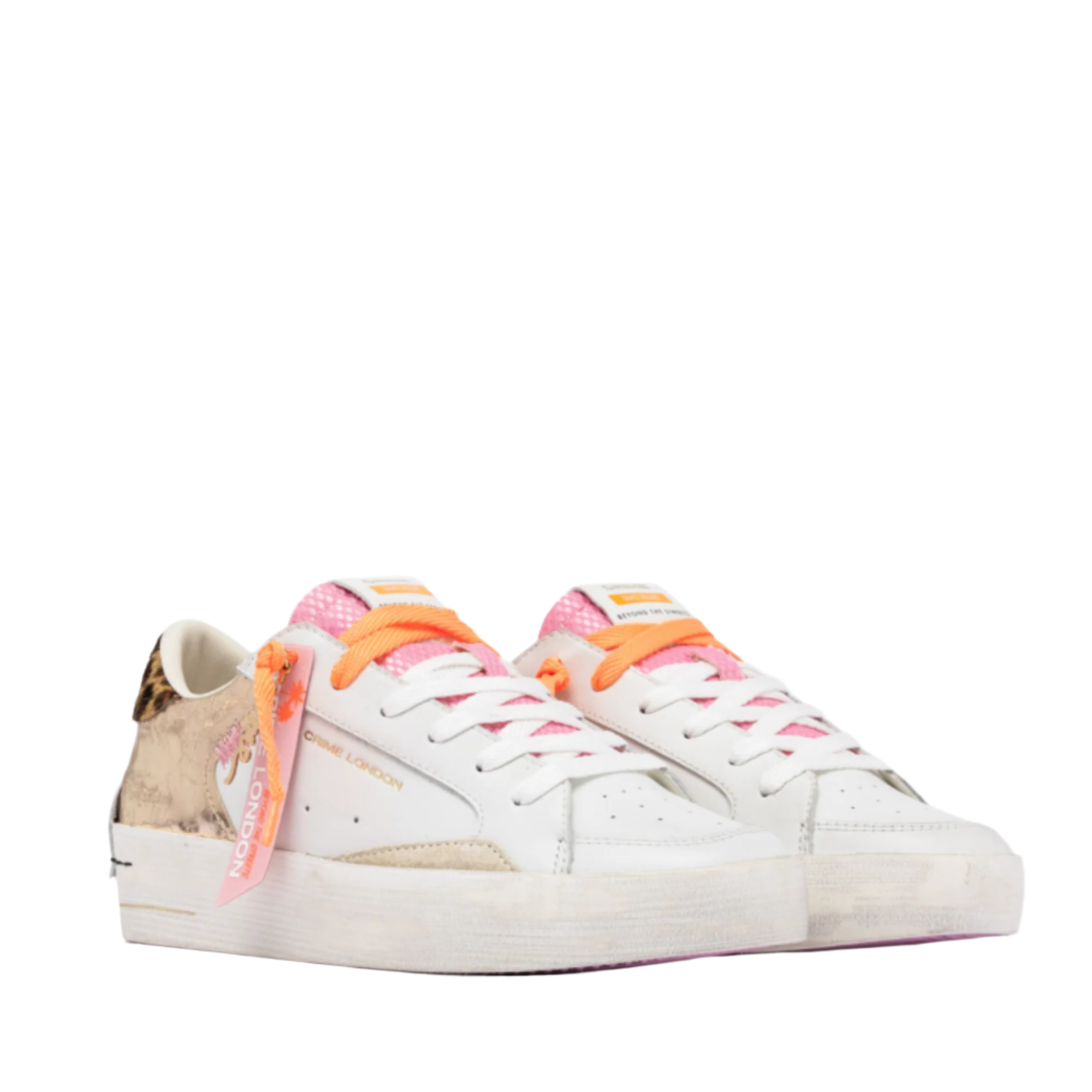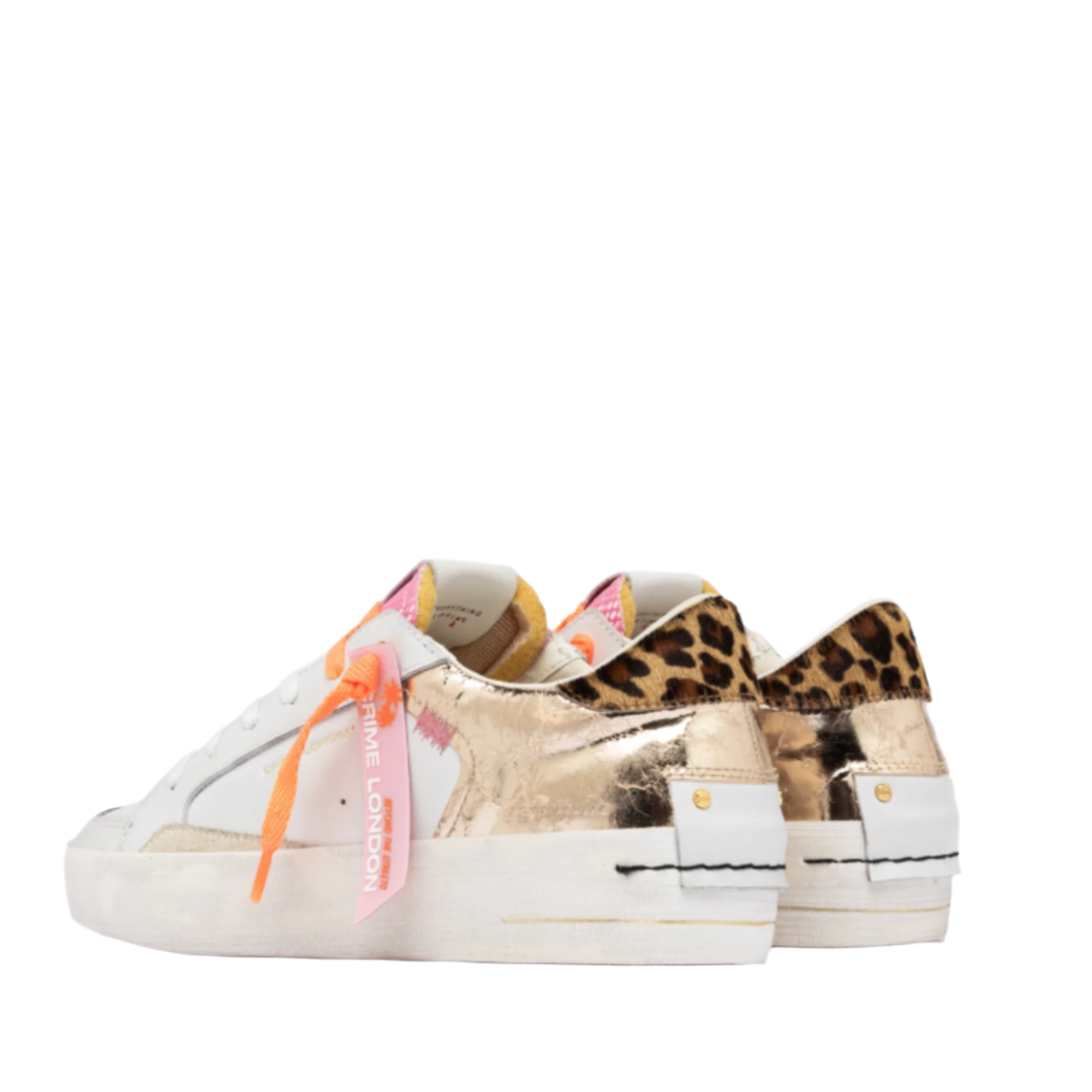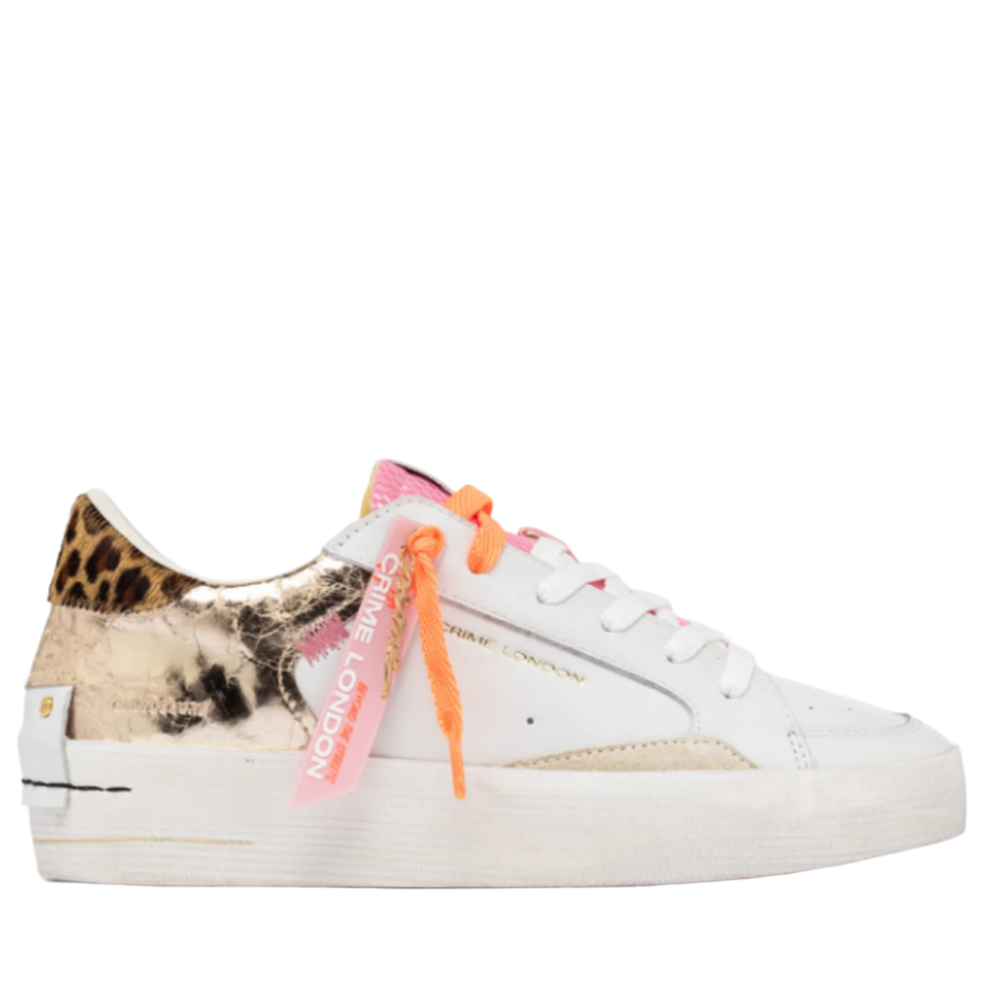 - White leather upper with platinum laminated cracklé, cream suede details
