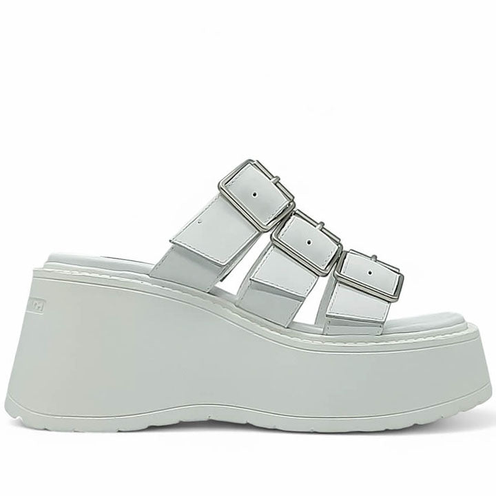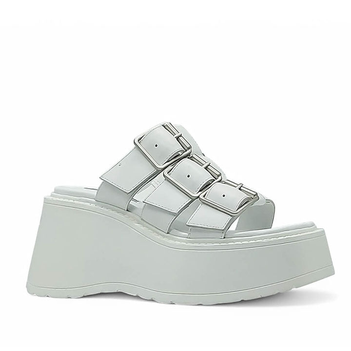 - White leather Sandalstraps with three adjustable oversized buckledNo backFaux leather liningRubber soleWelt with prominent notch7 cm heel, 4 cm platformFits true to size
