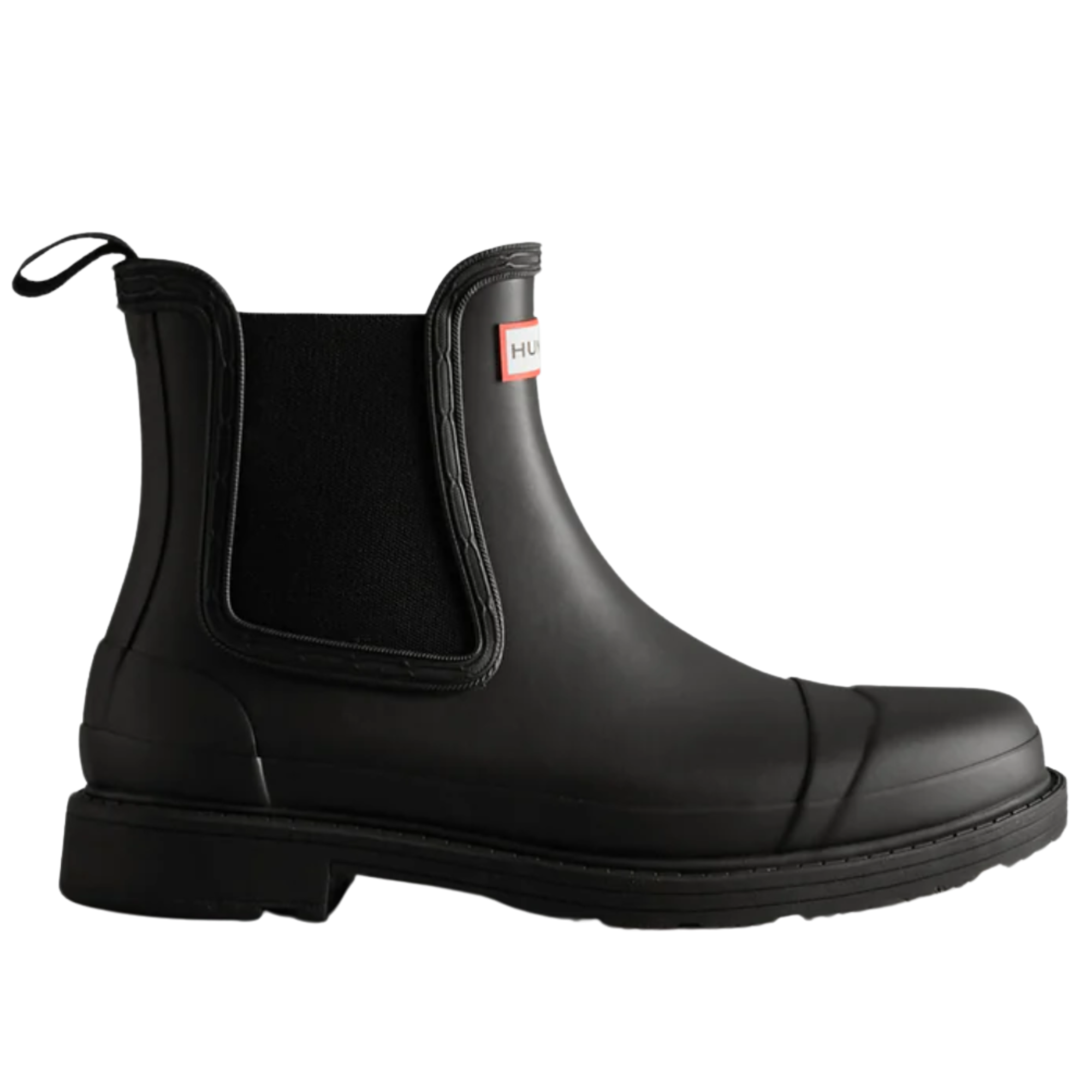 - The FSC®-certified Commando Chelsea Boot was crafted using natural rubber from forests independently audited to Forest Stewardship Council® standards. These 100% waterproof lower boots are handcrafted to strict standards to protect forests, as well as the animals and communities that depend on them. Crafted from natural FSC®-certified, vegan rubber, the 100% waterproof lower Commando Chelsea is an icon within our Original collection. Retaining all the beloved features of the Original Chelsea Boot, like the flexible gusset and Hunter grip, this new silhouette has a higher profile, reaching 15mm further up the leg. This women's black Chelsea boot style also features an updated recycled polyester lining and insole.